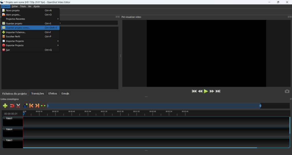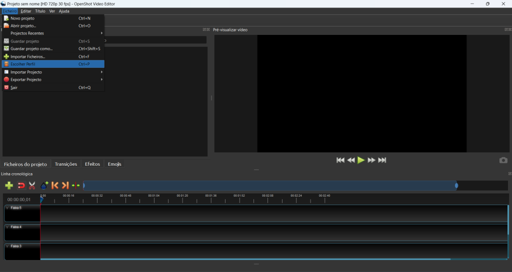Após abrir o OpenShot pela primeira vez pode seguir o tutorial. Clique no menu Ficheiro e depois em Escolher Perfil. Selecione o perfil HD 720p 29.97 fps. Este é as características utilizadas no Youtube. Depois devera gravar o projeto. Clique no menu Ficheiro e depois em Gravar projeto como… . Deverá escolher a pasta e o nome do projeto. Todos os ficheiros a utilizar neste projeto deverão ficar nesta pasta. Navegação de artigos OpenShot – InstalaçãoOpenShot – Importação de materiais