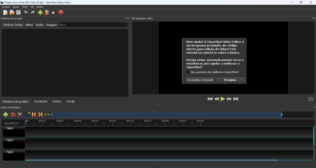 Após abrir o OpenShot pela primeira vez pode seguir o tutorial.